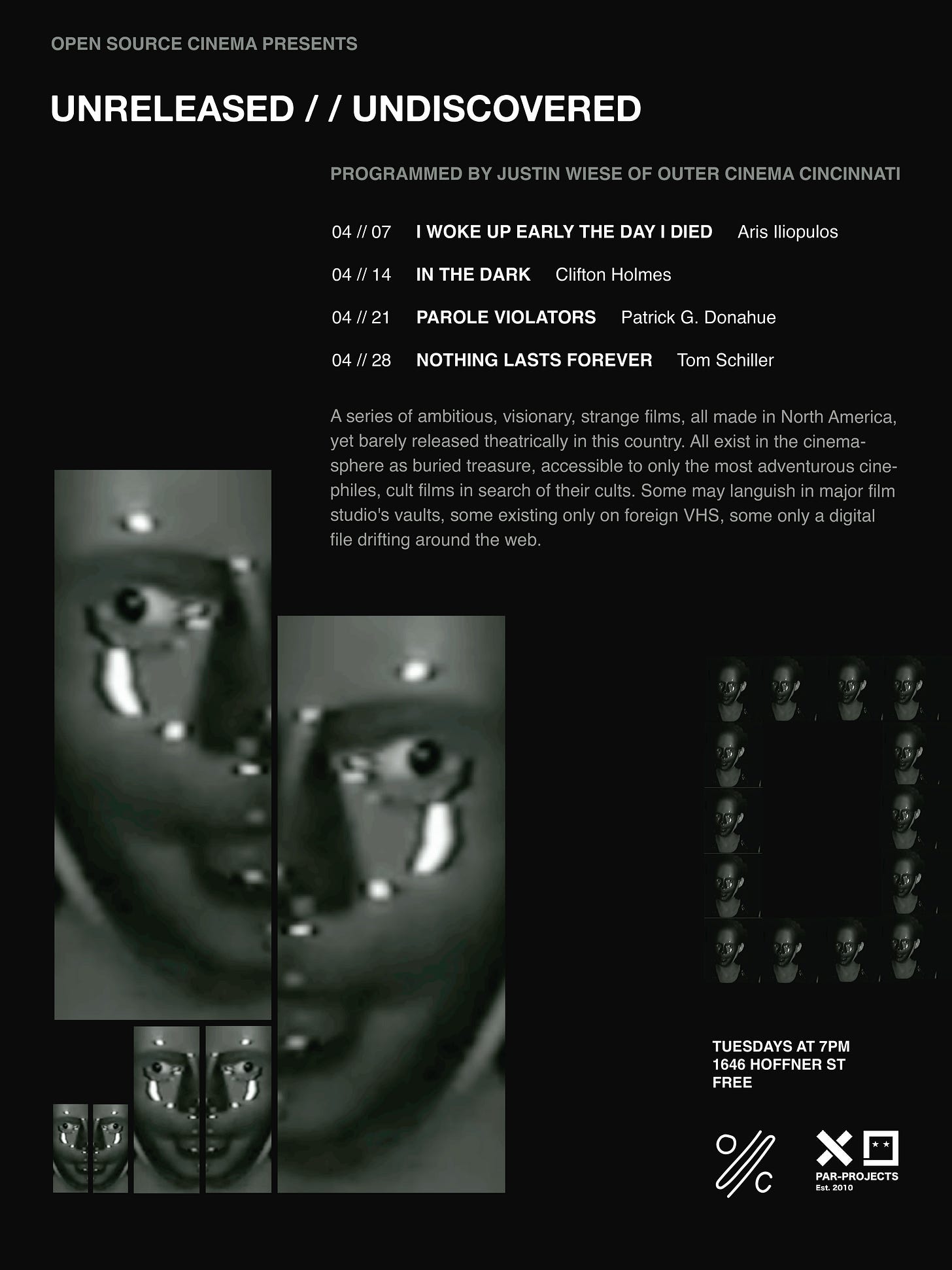 A series of ambitious, visionary, strange films, all made in North America, yet barely released theatrically in this country. All exist in the cinemasphere as buried treasure, accessible to only the most adventurous cinephiles, cult films in search of their cults. Some may languish in major film studio’s vaults, some existing only on foreign VHS, some only a digital file drifting around the web. The four Unreleased//Undiscovered films are: Aris Iliopulos and Billy Zane’s unhinged and bizarre Ed Wood-scripted slapstick I WOKE UP EARLY THE DAY I DIED, the truly unnerving and mysterious low-budget horror of Clifton Holme’s IN THE DARK, the gonzo action stunt mayhem of Patrick G. Donahue’s PAROLE VIOLATORS, and finally, the whimsical singular vision of Tom Schiller’s legendary unreleased fever dream NOTHING LASTS FOREVER.